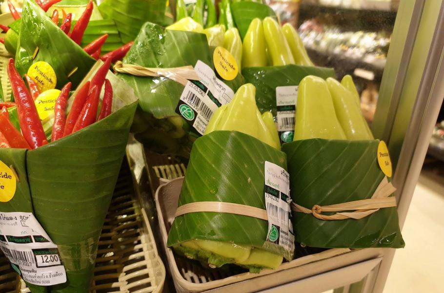 Pokud jste někdy večeřeli ve skutečné indické restauraci, možná jste byli překvapeni, že místo talíře používají indičtí restauratéři banánové listy. Nápad se zalíbil majitelům sítě thajských supermarketů a část jejich produkce je tak servírována v banánových listech převázaných provázkem z bambusu. Jde o zajímavý způsob, jak omezit produkci plastů.