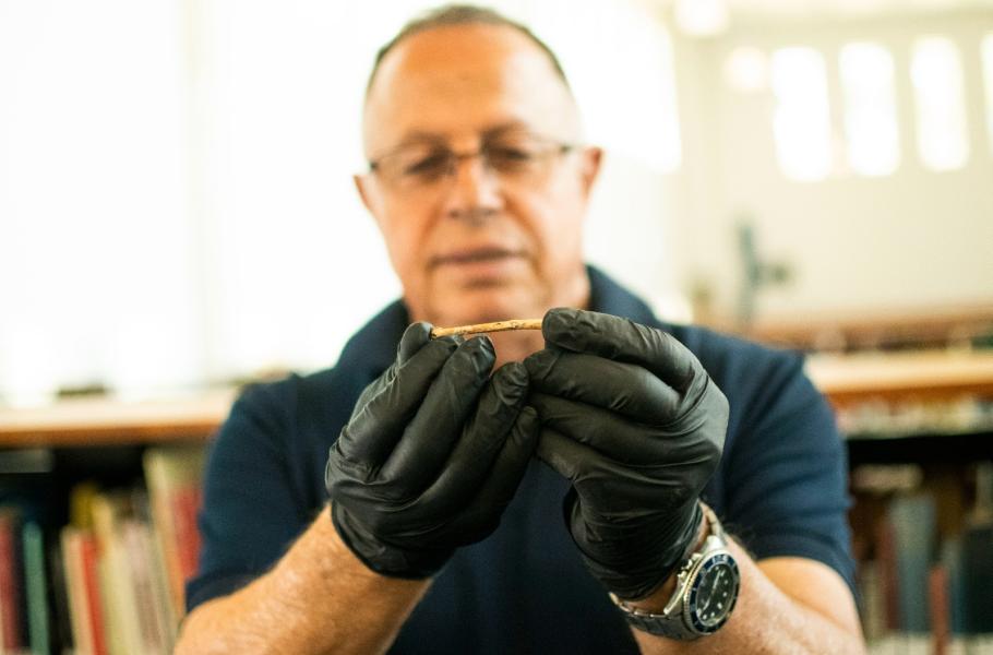 Dr. Hamoudi Khalaily s původní 12 000 let starou flétnou, objevenou v natufijské vesnici v severním Izraeli. (foto: IAA, Hamoudi Khalaily, CC BY-SA 4.0)