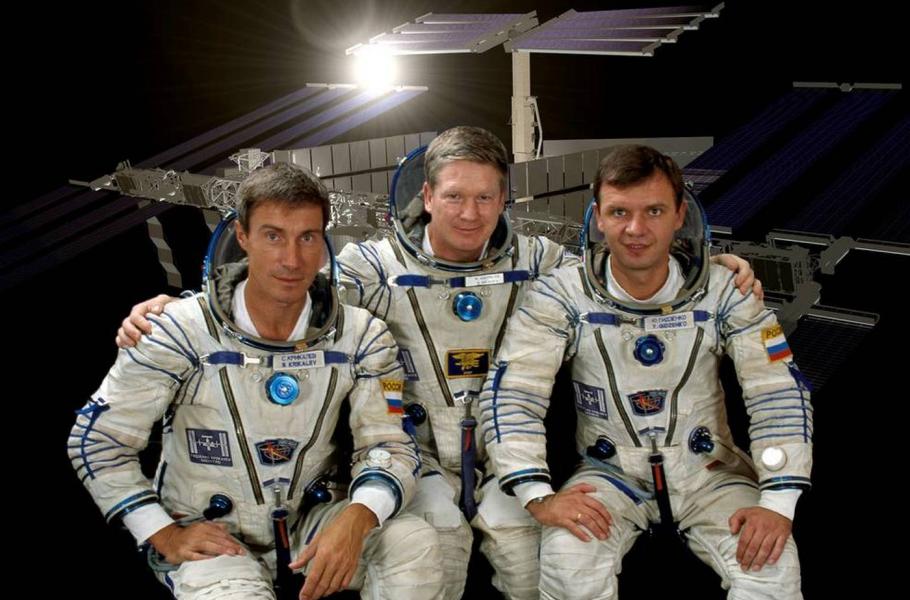 První posádka Mezinárodní vesmírné stanice (zleva): Sergej Konstantinovič Krikaljov, William Shepherd a Jurij Pavlovič Gidzenko.