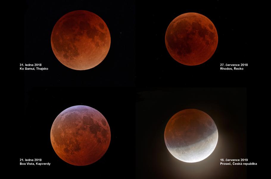 Každé zatmění Měsíce je jiné, jak dokládá i koláž všech zmíněných úkazů z let 2018 a 2019.