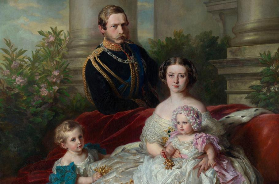 Pruský princ Fridrich s manželkou a dvěma staršími dětmi, princem Vilémem a princeznou Šarlotou. Portrét od Franze Xavera Winterhaltera, 1862. (ilustrace: Wikimedia Commons, PDM 1.0)