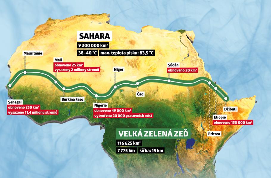V africkém sahelu se rozhodli bojovat se suchem a klimatickými změnami způsobem, který vyráží dech: Přes celý černý kontinent hodlají „vztyčit“ Velkou zelenou zeď. Nebudou ji však tvořit kameny ani cihly, jako její slavný protějšek v Číně, nýbrž stromy a další zeleň – což se může v pásu s extrémně horkým a suchým klimatem, který se táhne od Senegalu přes Nigérii až po Etiopii, jevit jako šílenství. Vlády afrických zemí a tisíce dotčených obyvatel si však myslí opak: V nehostinné krajině plánují vysadit pruh zeleně o délce 7 775 km a šířce 15 km. Ideu přijala za svou také Africká unie: Plán schválila již v roce 2007 a nazvala ho „Iniciativa Velké zelené zdi pro Saharu a sahel“.