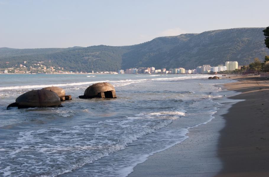 Na snímku jsou objekty, které si z pláže u města Durres vzalo moře. Mnohdy se betonové kryty stavěly na nesmyslných místech nebo střílnami proti sobě. (foto: Shutterstock)