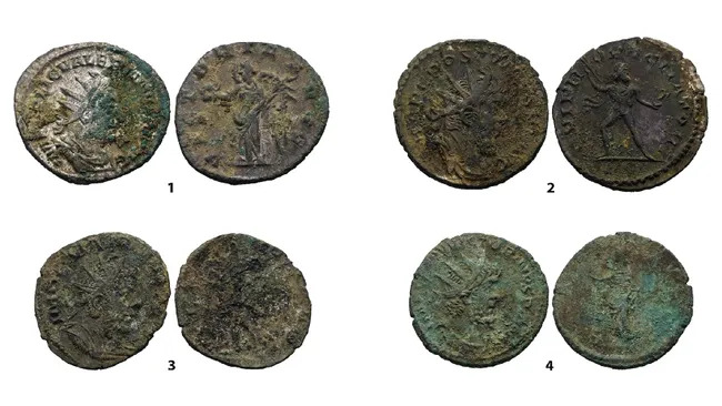 Mnoho z nalezených mincí je bohužel kvůli nepříznivým podmínkám ve velmi špatném stavu a doposud se podařilo identifikovat jen zhruba stovku z nich. Všechny pocházejí ze třetího století našeho letopočtu. Většinu z nich představují takzvané antoniniány, mince, které jako první nechal razit císař Caracalla od roku 215. Původně se tyto mince vyznačovaly vysokým obsahem stříbra, jeho obsah v pozdějších letech ale postupně klesal.