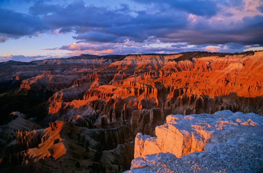 Rychle plující mraky stále tmavnou. Je pozdě odpoledne, poměrně chladno a větrno. Najednou se husté těžké mraky otevřou a zapadající slunce osvítí několik skalních špiček. Pak větší kus a nakonec celou na západ otevřenou skalní stěnu. Kaňon žhne jako oheň a my zůstáváme s úžasem stát – něco takového člověk nevidí každý den. Netrvá dlouho a červená je pryč. Cedar Breaks se velmi rychle noří do tmavnoucího šera. Ještě chvíli postáváme na okraji hluboké kotliny s četnými špičatými skalními útvary. Stále cítíme onen krátký okamžik nepopsatelné krásy, který v nás zůstane navždy.