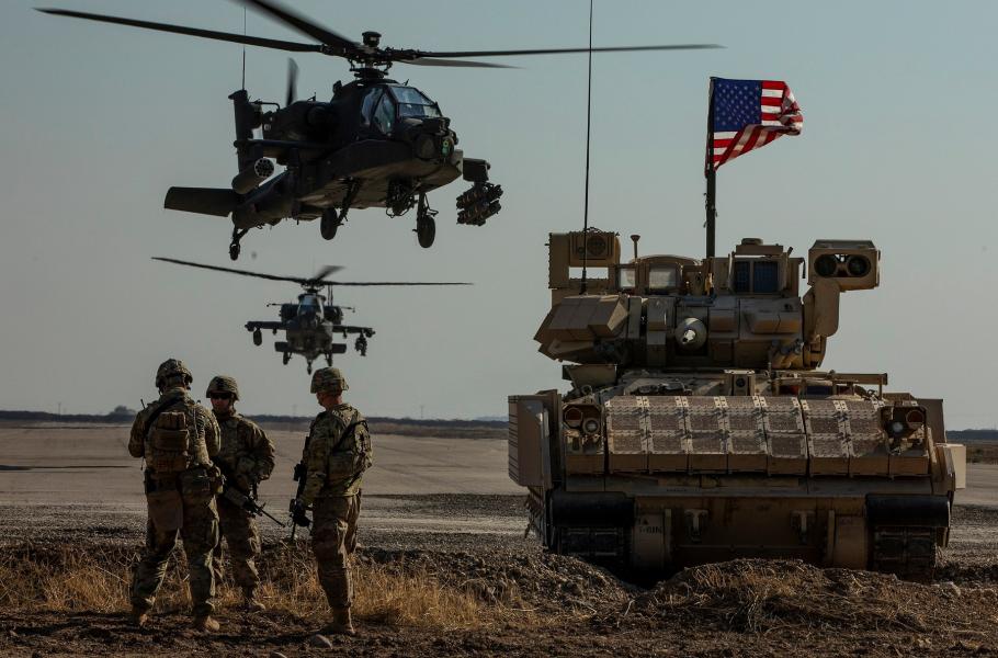 Američtí vojáci z jednotky Alpha s bojovým vozidlem pěchoty M2 Bradley a vrtulníkem AH-64 Apache v Sýrii. (foto: Wikimedia Commons, U.S. Army, Jensen Guillory, PDM 1.0)