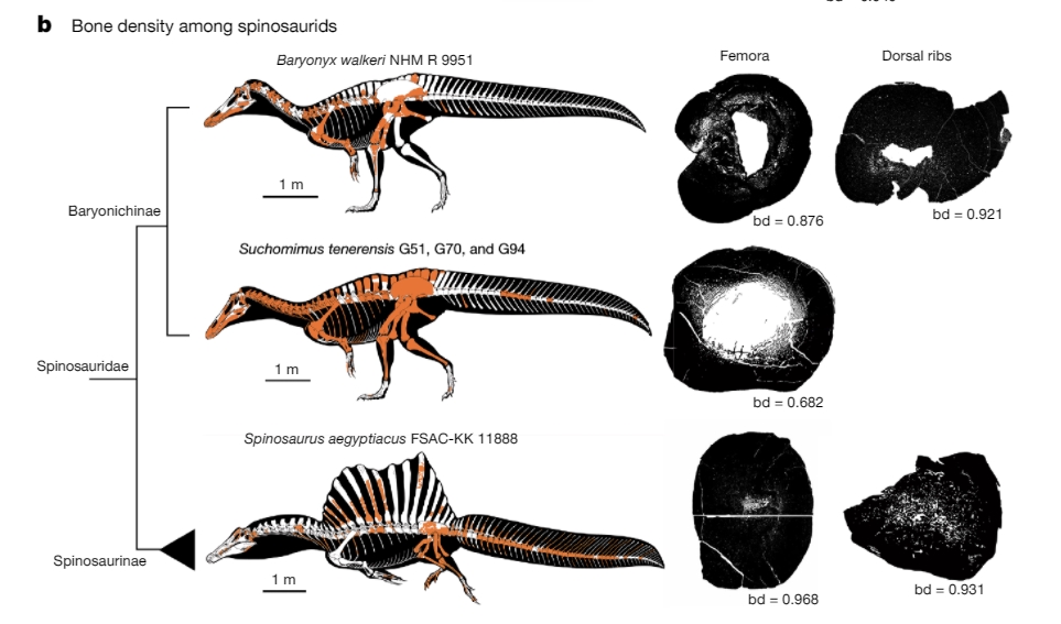 Srovnání hustory kostí spinosaura, baryonyxe a suchomima (foto: Nature, Matteo Fabbri, CC0)