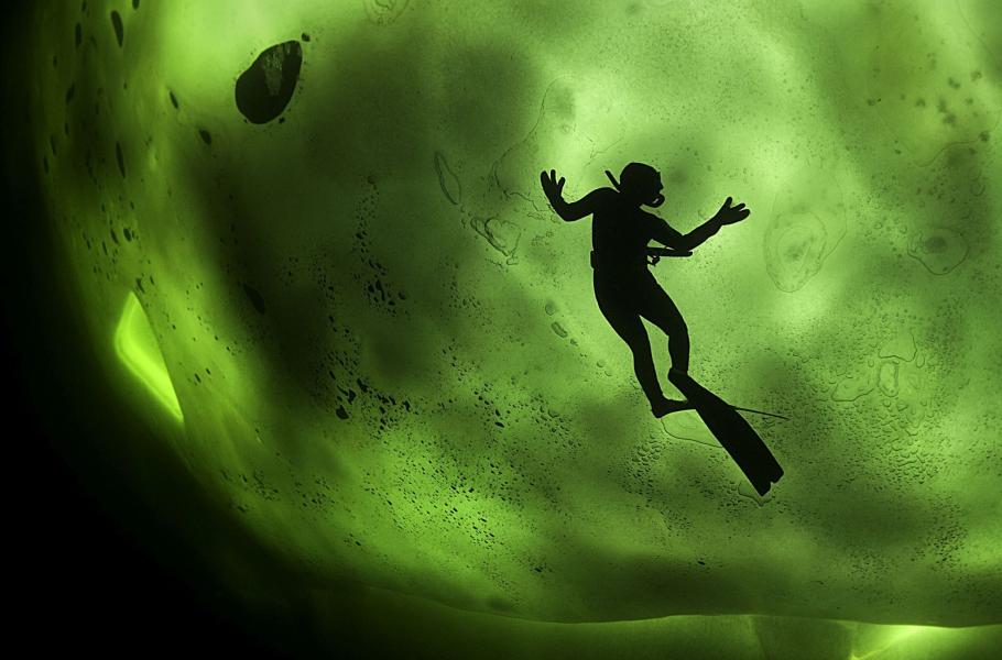 Jako nejdychtivější člen naší tříčlenné výpravy jsem šel pod led první. S fotoaparátem v ruce jsem přes okraj vklouzl do hodně tmavé a ledové vody a téměř okamžitě jsem přestal cítit pusu. Zima mi ochromila rty a po chvíli jsem ani nevnímal, jestli mám v puse šnorchl. Na chlad jsem ale okamžitě zapomněl v okamžiku, kdy jsem spatřil běluhy.