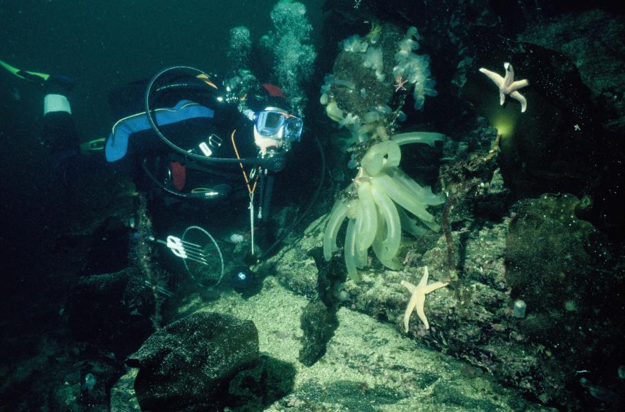 Závěrka fotoaparátu cvaká a zdánlivá podmořská poušť v mrknutí bleskové lampy na moment ožívá. V úkrytu kamenů se pohybují pestrobarevná chapadélka sumýšů a drobných mořských sasanek. Světlo odráží i různé druhy hvězdic, průsvitné laloky sumek tu a tam přichycených na kožovitých listech chaluh a také lastury měkkýšů. Nejsou tu ale zvířata, která se touto potravní nabídkou živí. Asi je to dobře, protože o podvodní setkání s mrožem ledním (Odobenus rosmarus) příliš netoužíme.
