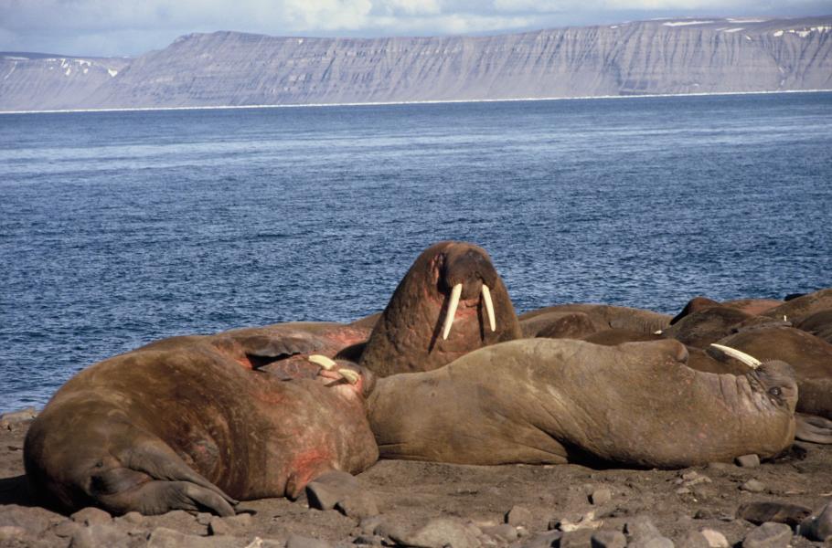 O pár chvil později se krčím za hranou terénu nad zátokou a opatrně nahlížím přes okraj. Asi padesát otylých mrožích těl si užívá sluneční idylky v prudkém místním vedru šesti stupňů nad nulou na kamenitém svahu u vody. Leží tu neuspořádaně na břichách, zádech nebo jeden přes druhého. Bílé kly trčí do všech možných směrů, jako by je tu právě vysypali z obřího pytle. Někteří se ve spánku drbou předními ploutvemi na lysé a vrásčité růžové kůži břicha, jiní se s hekáním a funěním převalují do jiné polohy, nebo se, podobni obrovským a tlustým housenkám, plazí namáhavě a pomalu nahoru po svahu. Nad celou tou valnou hromadou se rozléhá bohatýrské chrápání.