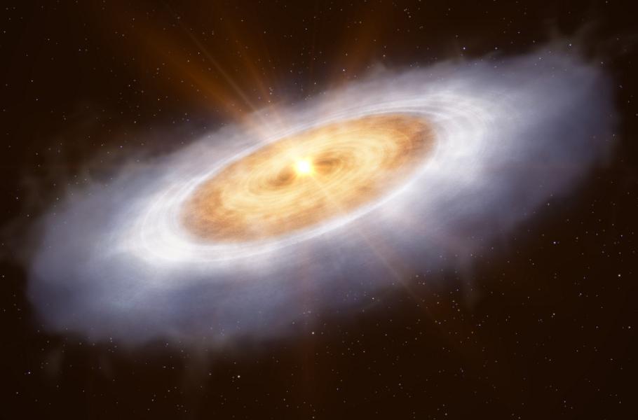 Ilustrace představuje protoplanetární disk kolem hvězdy V883 Orionis. Ve vnější části disku se voda vyskytuje ve formě ledu a není snadné ji detekovat. Zjasnění centrální hvězdy však ohřívá vnitřní část disku na teploty, při kterých je voda již ve formě páry, což astronomům umožňuje ji pozorovat. (ilustrace: ESO, L. Calçada, CC BY-SA 4.0)