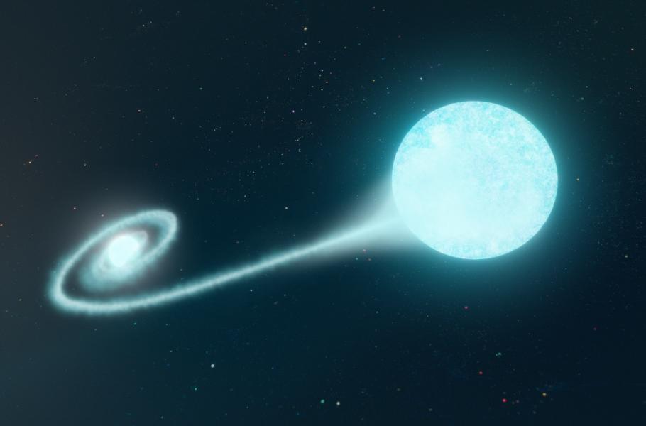 Vizualizace přenosu hmoty v dvojhvězdném a na helium bohatém systému. (ilustrace: National Astronomical Observatory of Japan/W. M. Keck Observatory, Adam Makarenko, CC BY-SA 4.0)