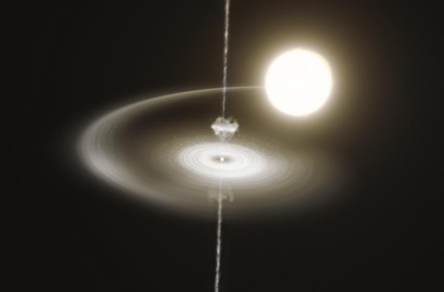 Ilustrace zachycuje pulsar PSR J1023+0038, který vtahuje plyn ze svého souputníka – běžné hvězdy. Materiál se hromadí v disku kolem pulsaru, pomalu padá směrem k němu a je vypuzen v podobě úzkého jetu (výtrysku). (ilustrace: ESO/M. Kornmesser, CC BY-SA 4.0)