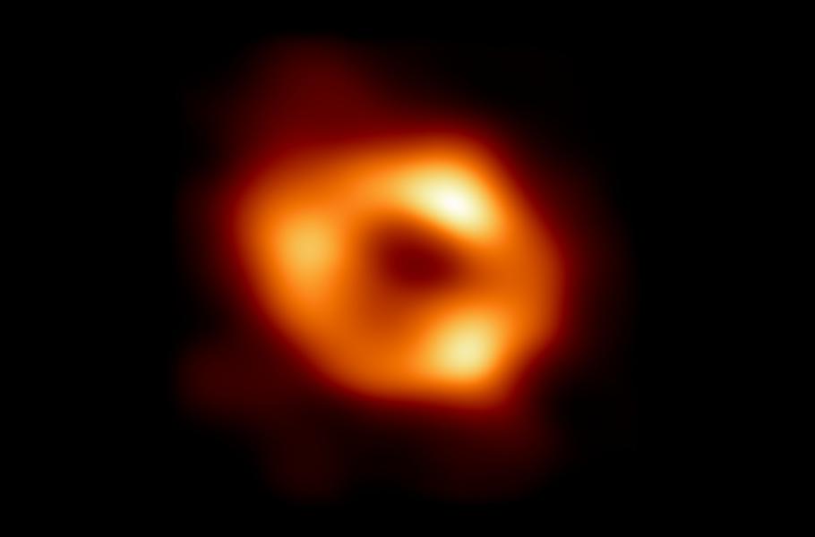 Astronomové zveřejnili první snímek superhmotné černé díry v centru naší Galaxie. Zachycuje paprsky světla zakřivené v silném gravitačním poli černé díry, která je čtyřmilionkrát hmotnější než Slunce.