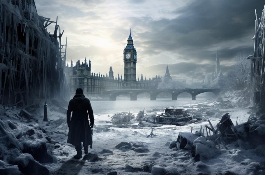 V případě kolapsu atlantické meridionální cirkulace by podle nové studie v některých částech Evropy klesly teploty o více než 20 °C.(ilustrace: Midjourney AI, PDM 1.0)