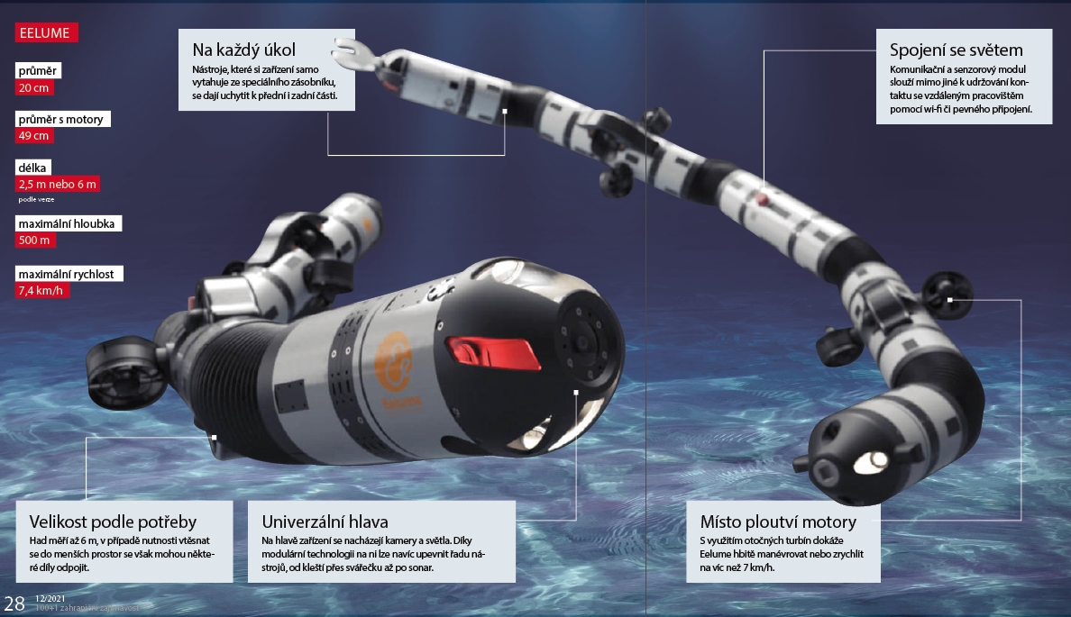 Řešením, které zmíněné požadavky splňuje a zároveň je ekologicky udržitelnější, by se mohl stát robotický „had“ společnosti Eelume: Na délku měří až šest metrů a setrvával by přímo na stanovišti pod hladinou. Jeho předpokládaná pracovní hloubka činí 500 metrů a současný prototyp vydrží ve vodní skrýši i šest měsíců. Na jedno nabití urazí pomocí speciálních motorů až 20 km, klíčovou výhodu však tvoří jeho univerzálnost. Díky modulárnímu designu lze totiž na oba konce připnout některé z široké sady nástrojů z podvodního zásobníku. Před každou akcí se tak had vybaví přesně podle očekávaných potřeb, načež dorazí na místo, provede údržbu a vrátí se do nabíjecí stanice. Jeho skladné tělo se navíc vejde i do stísněných prostor.