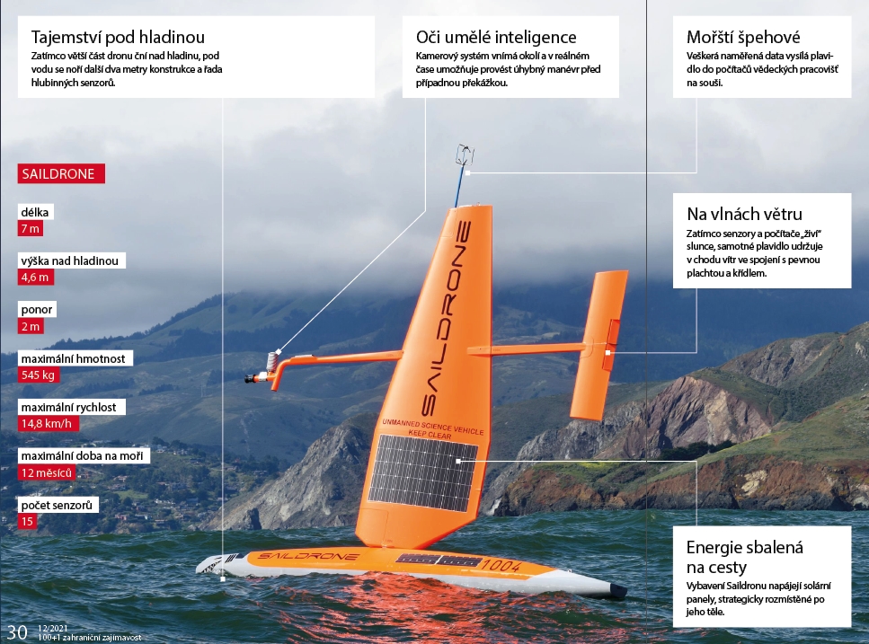 Zatímco stroje Eelume ostré nasazení teprve čeká, bezpilotní Saildrone křižuje oceány již osm let. Větrem poháněné plavidlo, vybavené řadou měřicích technologií a počítači, napájejí solární panely. Už v prvním roce přitom stanovilo rekord, když vlastními silami a pouze za přispění větru dorazilo z Kalifornie až k Havaji: Cesta dlouhá téměř 4 000 km mu trvala 34 dnů. Od té doby se dron dál vyvíjí a vylepšení doznal nejen jeho pohon.