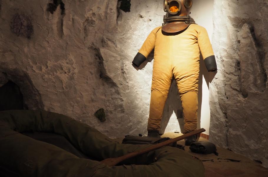 Oblek je vyroben z pogumovaného plátna, pochází z dílny firmy Dräger v Lübecku a je starý přesně 106 let. Dnes bychom pohyb v něm považovali téměř za nemožný. Těžká kovová přilba se čtyřmi průzory a vstupy pro přívod vzduchu rozhodně nenabízela luxusní výhled. Na zádech měl potápěč zásobník vzduchu a na hrudi zařízení pro přifukování skafandru. Korunu všemu dodávaly olověné boty, které sice pomáhaly potápěči klesnout pod hladinu, ale na dně silně vířily usazené sedimenty a kalily tak vodu.