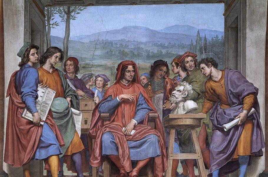 Lorenzo řečený Nádherný, obklopen umělci v sochařské dílně, se setkává s Michelangelem. (ilustrace: Wikimedia Commons, Ottavio Vannini, CC0)