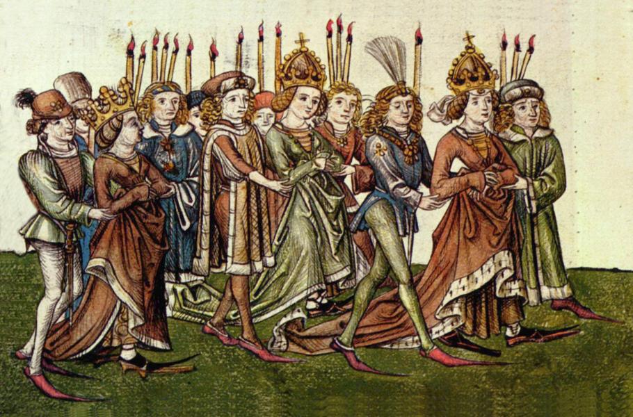 Královna Barbora Celjská (vpravo) s dcerou Alžbětou Lucemburskou na cestě do Münsteru.