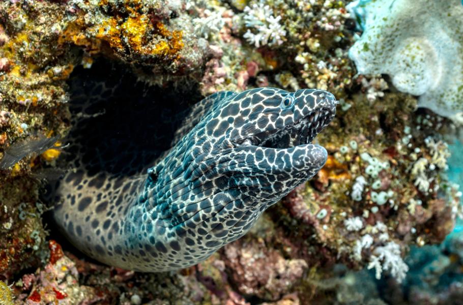 Murény mohou dorůstat až sto padesáti centimetrů a vážit kolem patnácti kilogramů. Schovávají se ve štěrbinách skal či třeba vraků, odkud potom loví svou kořist. Při útoku však obvykle nevysouvají ven víc než polovinu těla. (foto: Shutterstock)