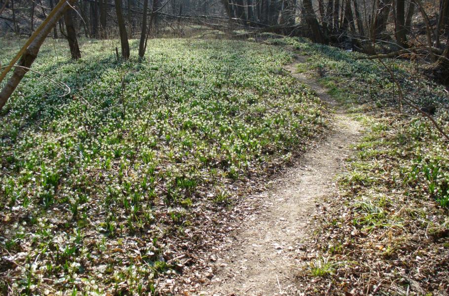 V časném jaru se však niva Chlébského potoka stává především poutním místem vyznavačů prvních jarních květů, kteří jsou po zimě „vyhládlí“ touhou po první křehké kráse. Jejich touha je do sytosti ukojena statisíci kvítků bledulí jarních. Nutno podotknout, že „hladových“ tu bývá opravdu hodně. Proto je dobré zamířit do jinak tichých míst ve všední den.