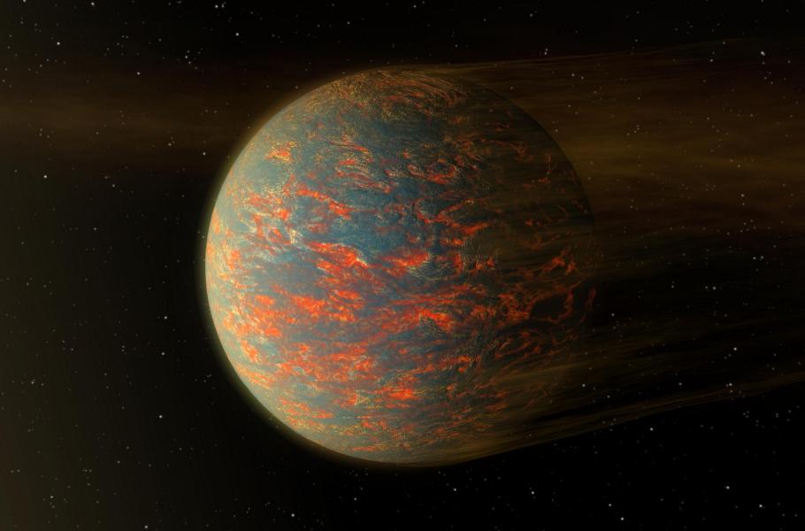 GJ 367 b, známá též jako Gliese 367 b, je v mnoha ohledech extrémní: V podstatě představuje ohnivý kus železa, a přestože krouží okolo červeného trpaslíka, přijímá od něj 576krát víc záření než naše planeta od Slunce. Předpokládaná teplota na její denní straně tak přesahuje 1 500 °C. Hmotnost GJ 367 b odpovídá 0,633násobku Země, její hustota byla určena na 8,1 g/cm³ a s jádrem sahajícím do 86 % jejího průměru se podobá Merkuru. Dělí ji od nás 31 ly a svou mateřskou hvězdu oběhne za 7,7 hodiny. Pravděpodobně přitom nemá žádnou atmosféru. (ilustrace: NASA, CC BY 4.0)