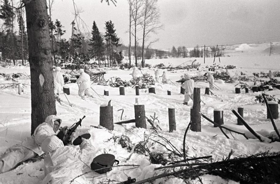 Snímek z prosince 1941 dobře ilustruje, že kvalitně maskovaní rudoarmějci mohli útočníky snadno překvapit. Na fotografii se nachází minimálně 11 vojáků v převlečnících s kapucemi.