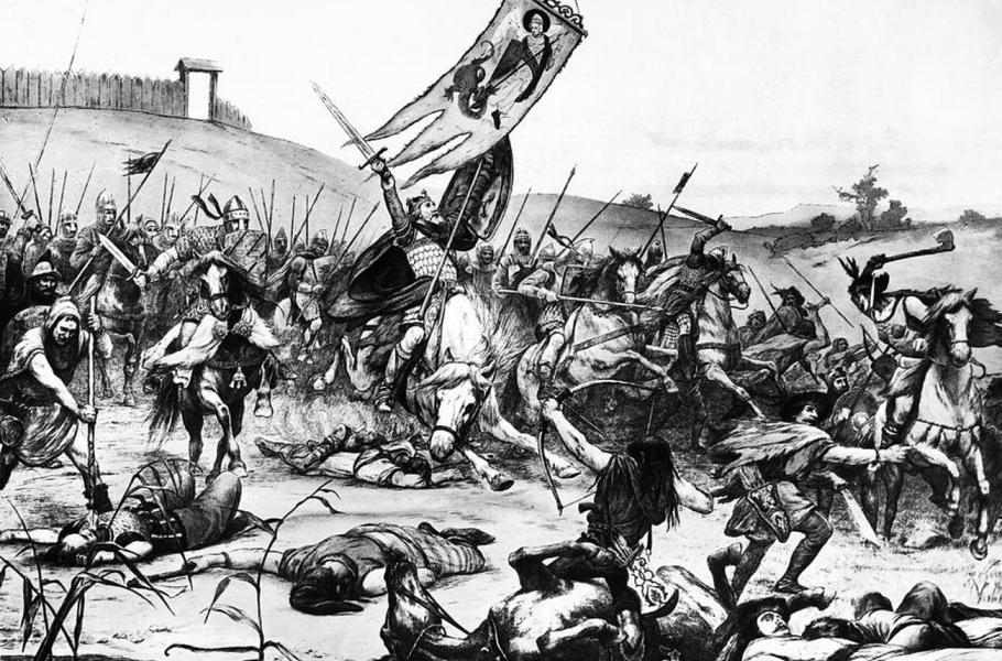 Po překvapivém útoku Maďarů u Lechu padli téměř všichni čeští bojovníci. (ilustrace: Wikimedia Commons, PDM 1.0)