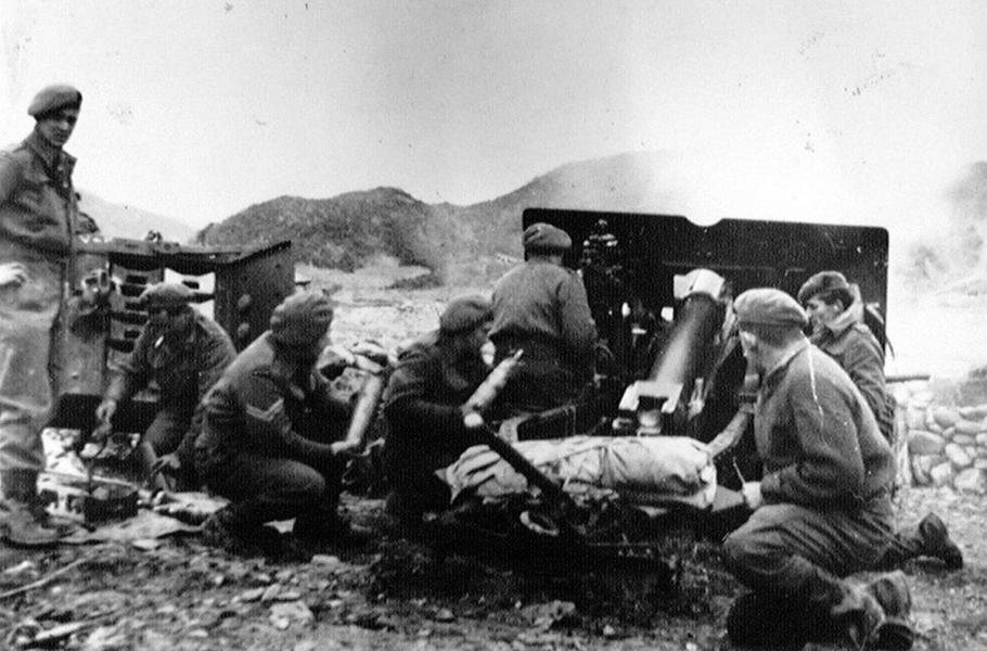 Britští dělostřelci během bitvy u řeky Imdžin, 1951. (foto: National Army Museum, PDM 1.0)