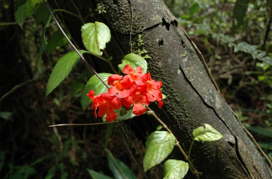 Sytě červené nápadné květy liány rodu Agalmyla jsem fotografovala na úbočí hory Halcon, na filipínském ostrově Mindoro
