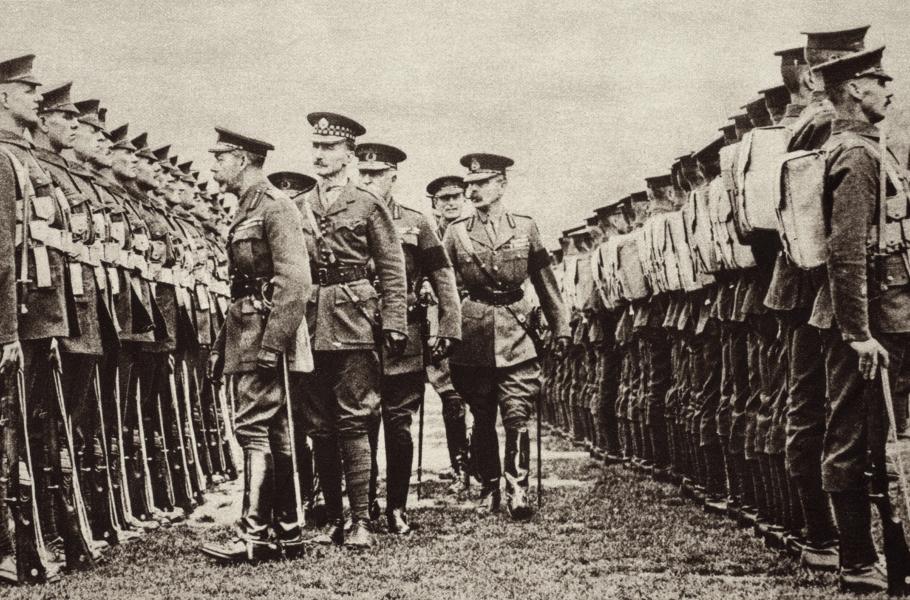 Král Jiří V. na inspekci rekrutů, kteří zanedlouho zamíří na západní frontu. Za panovníkem stojí Horatio Kitchener.