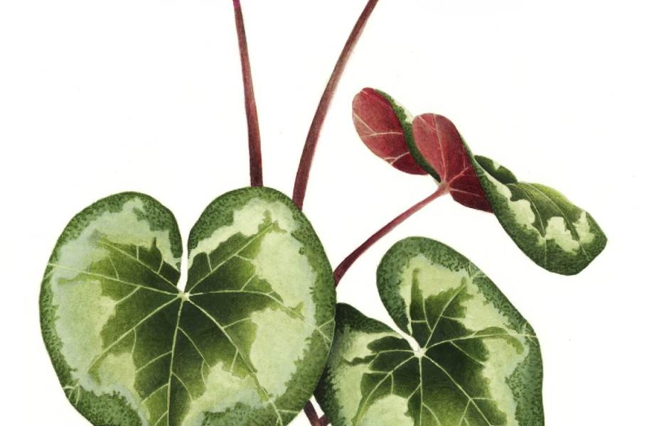 Listy a stvoly nesoucí květy vyrůstají z krátkého krku na vrcholu hlízy. Listy jsou ledvinovité, celokrajné a lesklé, obvykle mají stříbrnou kresbu a na spodní straně jsou purpurové.