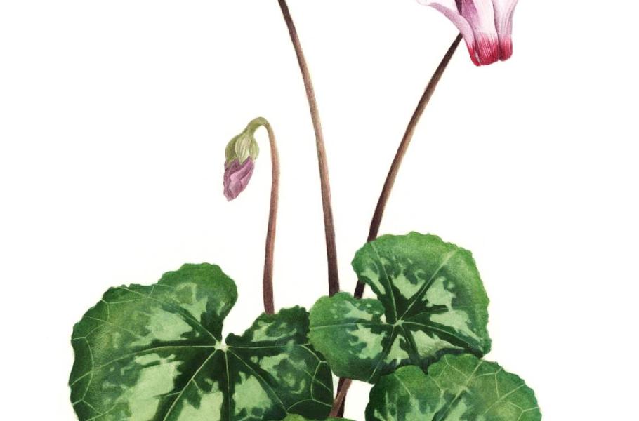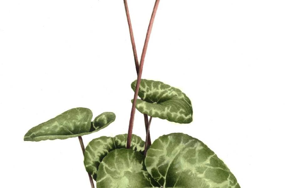 Z vrcholu hlízy vyrůstá krátký vzpřímený oddenek, na jehož konci raší listy a květy. Listy jsou široce okrouhlé až ledvinovité, s dlouhým řapíkem, zespodu purpurové. Jsou zelené přes zimu, zatahují koncem jara.