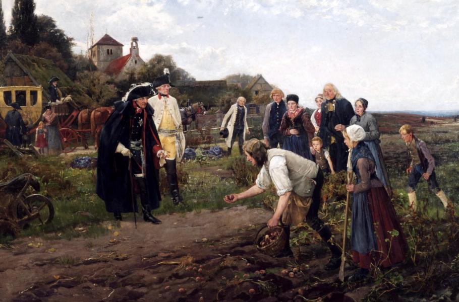 Asi jediný, kdo v těch neradostných dobách ještě v bramborách viděl nějaký potenciál, byl pruský král Fridrich Veliký. Přišlo mu, že by tahle jihoamerická rostlina – pokud by byla pěstována ve velkém – jednou třeba dokázala odvrátit hladomor. Na jeho pokyn se lilky bramboru pěstovaly v braniborských zámeckých zahradách. Jen mu k tomu chyběli nějací dobrovolní strávníci. Fridrich je našel až ve francouzských vojácích, kteří v průběhu Sedmileté války (1756–1763) padli do pruského zajetí. Ano, v době vzdálené nějakým ženevským konvencím nikomu nepřišlo závadné krmit zajaté nepřátele něčím, co se mělo za napůl jedovaté a jinak by to ani pes nejedl.