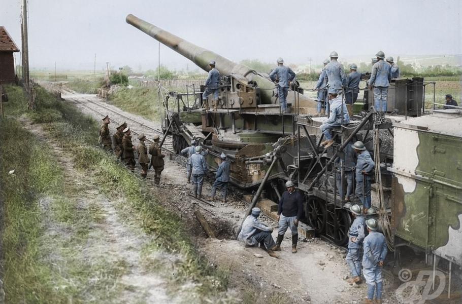 Tento krok pak výrazným způsobem zvýšil mobilitu a navíc nabízel využití pro obrovské kanony původně určené pro bitevní lodě či křižníky. Unikátní kolorovaná fotografie zachycuje kanadské důstojníky během návštěvy palebného postavení francouzského 305mm železničního děla (Canon de 305 mm Modèle 1893/96) kdesi na západní frontě v říjnu 1917. Těchto kanonů měla Paříž společně s dalšími většími i menšími rážemi k dispozici několik desítek, a to převážně ze zastaralých válečných plavidel, především predreadnoughtů. První specializované železniční podvozky pro lafetaci těžkých děl Francouzi vybudovali v roce 1915.