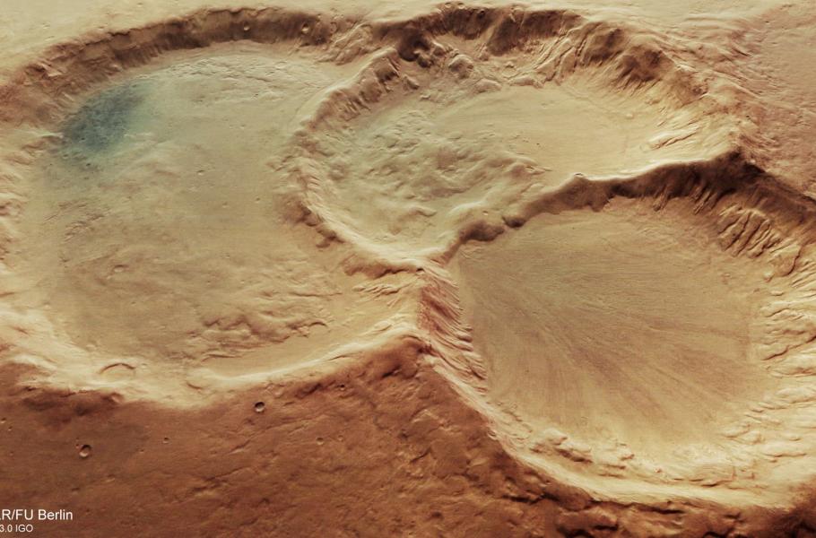 Trojitý kráter z oblasti Noachis Terra jak jej zachytila letos v říjnu sonda Mars Express. Největší z nich měří napříč asi 45 km nejmenší zhruba 28 km.