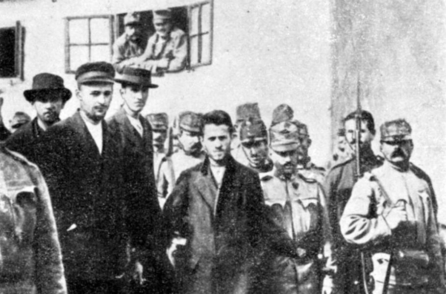 Stráž vede sarajevské atentátníky z vězení k soudu, uprostřed Gavrilo Princip, v pozadí Nedeljko Čabrinović a Danilo Ilić. (foto: Wikimedia Commons, CC0)