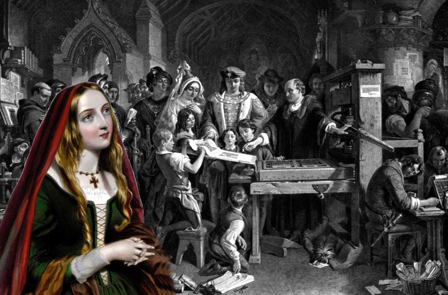 William Caxton představuje Edwardu IV. a Alžbětě Woodvillové poprvé knihtisk. Obraz Daniela Maclise zachycuje kromě královského páru i jejich potomky – Alžbětu, Edwarda a Richarda. Vlevo portrét Alžběty Woodvillové.