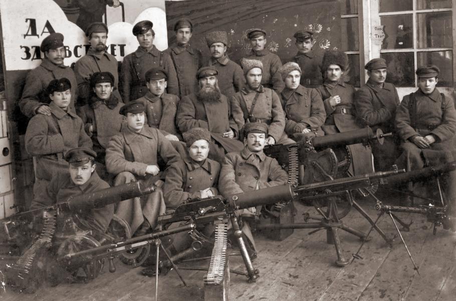 Vyšší velitelská střelecká škola Rudé armády v Petrohradě. Zleva kulomet Maxim, lehký kulomet Gladiator-Chauchat, Schwarzlose, Colt-Browning, německá verze kulometu Maxim, lehký Lewis a zcela vpravo Madsen. (foto: Oldphoto.info - se souhlasem k publikování)