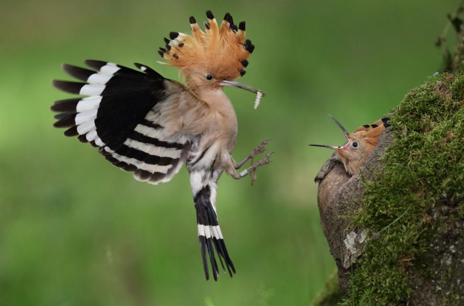 Fotografování dudků se věnuji už několik let a za tu dobu jsem o jejich životě získal zajímavé poznatky a pár unikátních fotografií. Na všechna setkání s nimi vzpomínám rád, ale jedno mi zvlášť utkvělo v paměti. Vyrazil jsem v pět hodin ráno na mně dobře známé místo, které je oblíbenou lokalitou hnízdících dudků. Chtěl jsem zaznamenat krmení a snad i vidět první nesmělá máchnutí křídel mladých jedinců. Když jsem však dorazil, byla už jedna hnízdní dutina prázdná. Našel jsem bohudík jinou, která byla k mému překvapení obsazená čtyřmi mláďaty. Během 15 minut se rodiče stačili vystřídat u dutiny celkem třikrát, takže intenzita krmení byla opravdu na nejvyšším stupni.