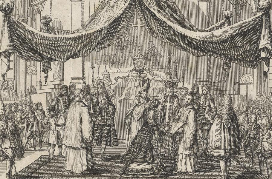Pražská korunovace: Karel VI. přísahá na Písmo svaté, zatímco arcibiskup drží nad jeho hlavou korunu. (ilustrace: Wikimedia Commons, Rijksmuseum, CC0 1.0)