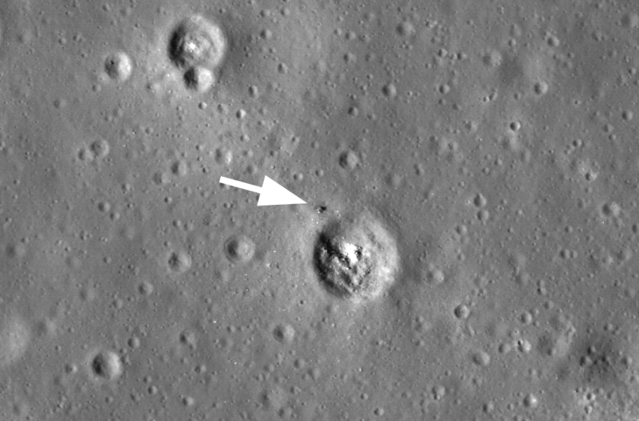 Snímek zachycuje přistávací stupeň Luny 24 zanechaný na Měsíci, jak jej vyfotila americká sonda LRO.