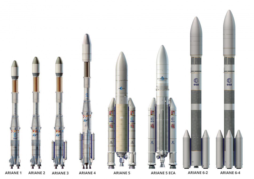 Evoluce raket Ariane 1-5, Ariane 5 ECA, Ariane 6-2 a Ariane 6-4. (zdroj: ESA, CC BY-SA 4.0)