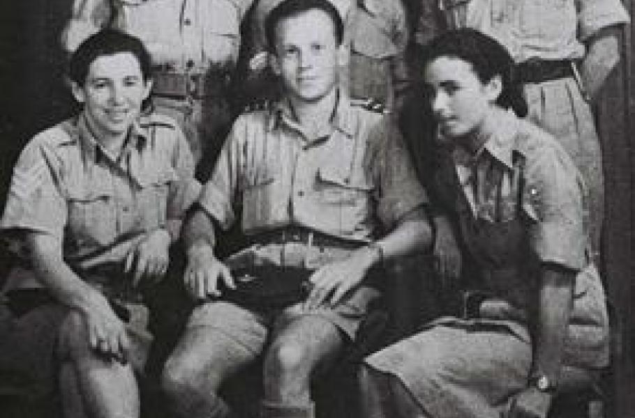 Skupinka židovských parašutistů v italském Bari v březnu či dubnu 1944. Chaviva Reiková sedí první zleva, přímo nad ní stojí Aba Berdičev