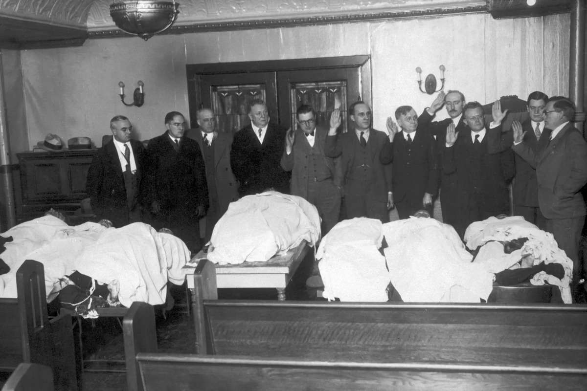 Zvláštní výbor skládající přísahu nad těly obětí valentýnského masakru. (foto: Getty Images)