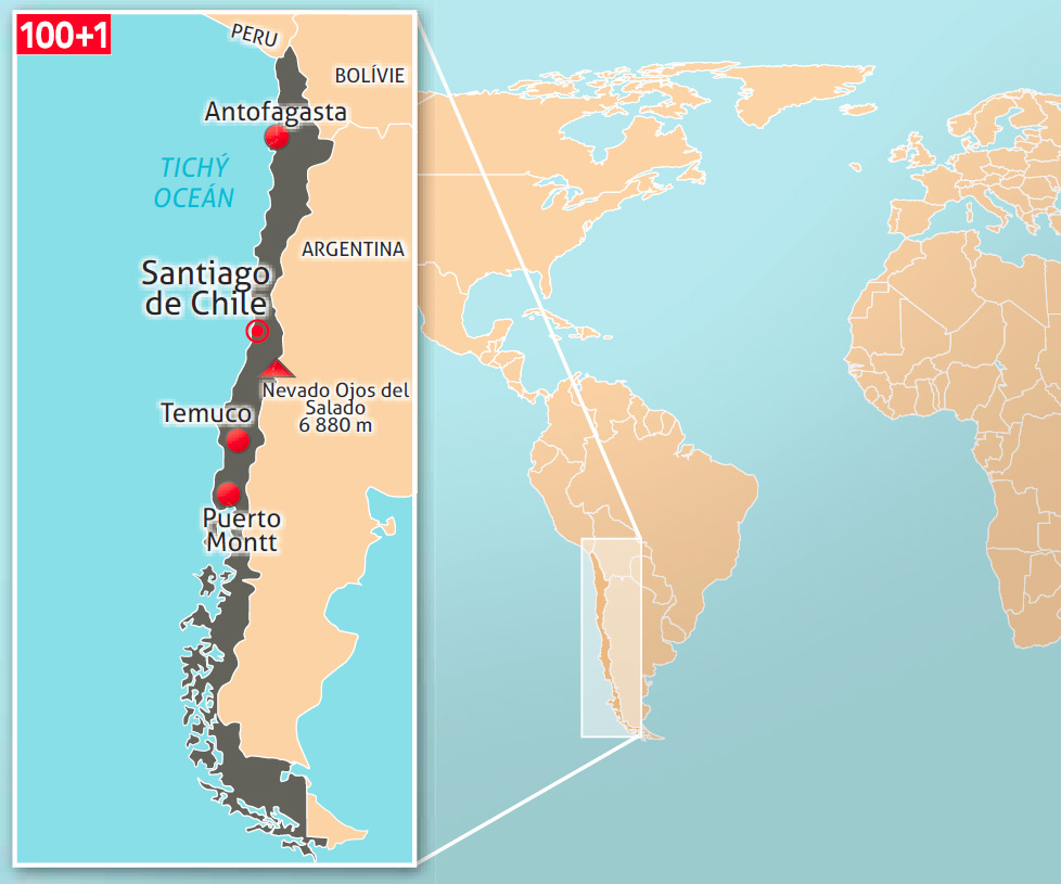 Nejnižší a nejvyšší bod: Tichý oceán 0 m / Nevado Ojos del Salado 6 880 m