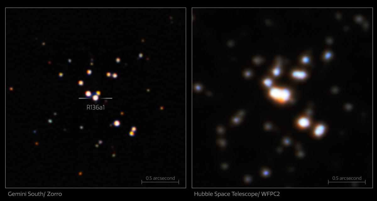 Vlevo snímek oblasti s hvězdou R136a1 ze zařízení Zorro na Gemini South, vpravo stejný snímek z Hubbleova dalekohledu. (foto: NOIRLab/NSF/AURA, J. da Silva/Spaceengine, CC BY-SA 4.0)