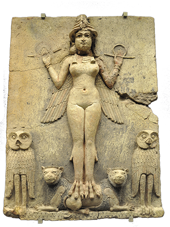 Lev a osmicípá hvězda patřily mezi symboly bohyně Ištar, oslavované v Sumeru a Babylónii. Měla na starosti plodnost, lásku, pohlavní život, ale i válku. Mytologie ji vykresluje jako navýsost emancipovanou ženu neklidné povahy, před kterou se všichni muži museli mít na pozoru. Posvátný sňatek považovala stejně jako všichni její uctívači za nejvyšší projev odevzdanosti a duchovna. O co šlo? V chrámu této bohyně vybraná kněžka pojala náhodně vybraného muže z davu na jednu noc za svého.