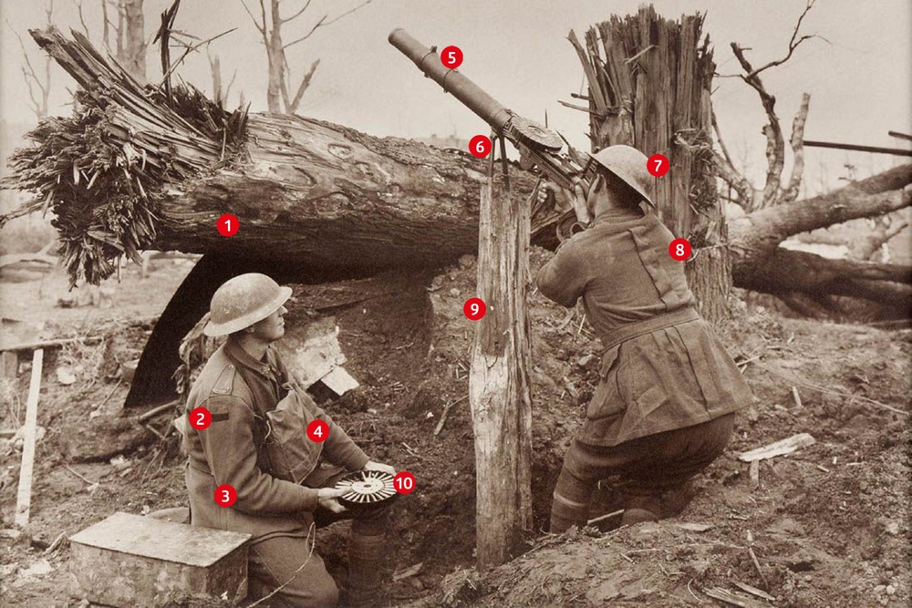 Ty těžké bylo zapotřebí umístit na vhodnou k tomu účelu určenou lafetu, ale objevovaly se i polní improvizace v podobě nejrůznějších kol, která se dala snadno otáčet. V případě lehčích zbraní se pak dalo proti letadlům sice pálit z ruky, ale vojáci často volili většinou improvizované „stojany“. To je případ i této dvojice Australanů z I. praporu, kteří si na podzim 1917 zřídili protiletadlové stanoviště nedaleko belgických Yper během bitvy u Passchendaele.